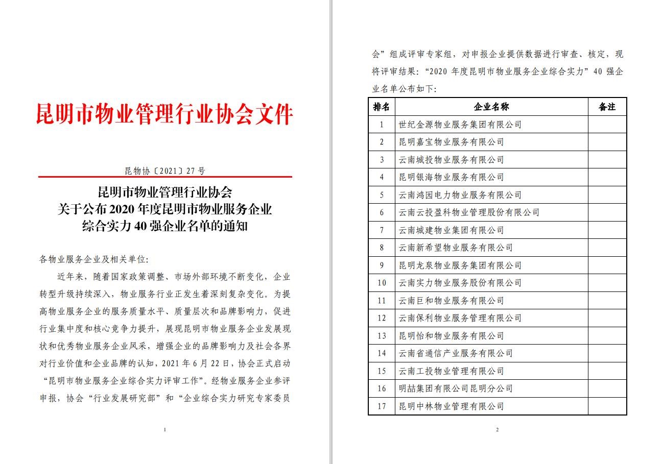 昆明睿信城市運營管理有限公司入選2020年度昆明市物業(yè)服務(wù)企業(yè)綜合實力40強名單