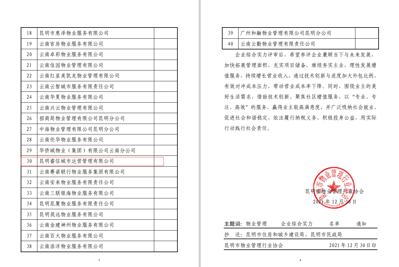 2022年1月,昆明睿信城市運營管理有限公司經(jīng)昆明市物業(yè)管理行業(yè)協(xié)會評審專家組審查核定評議,榮獲“昆明市物業(yè)服務(wù)企業(yè)綜合實力”第30強。
